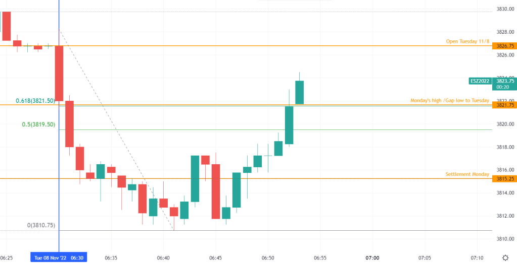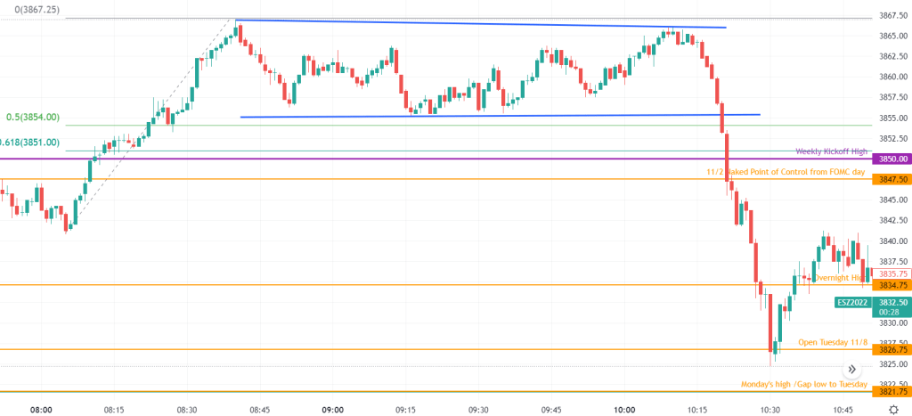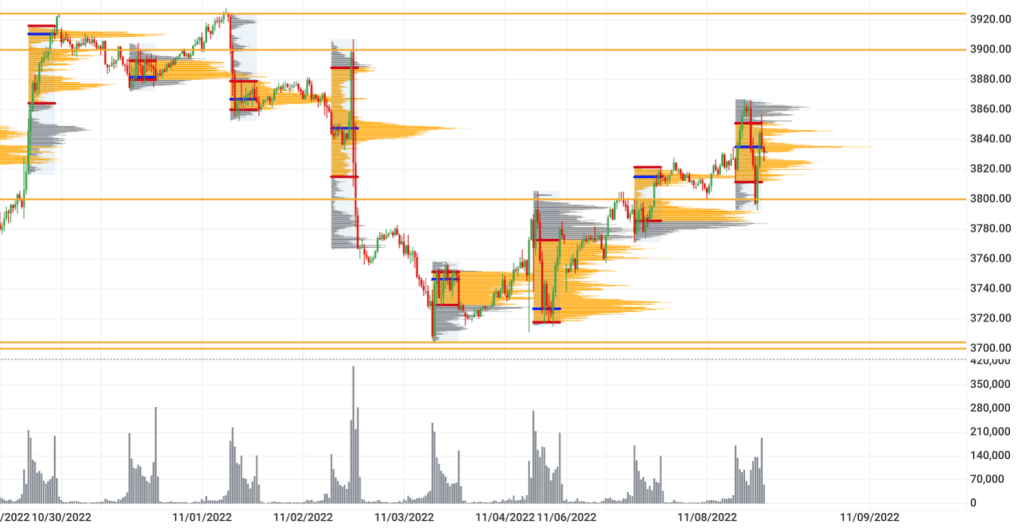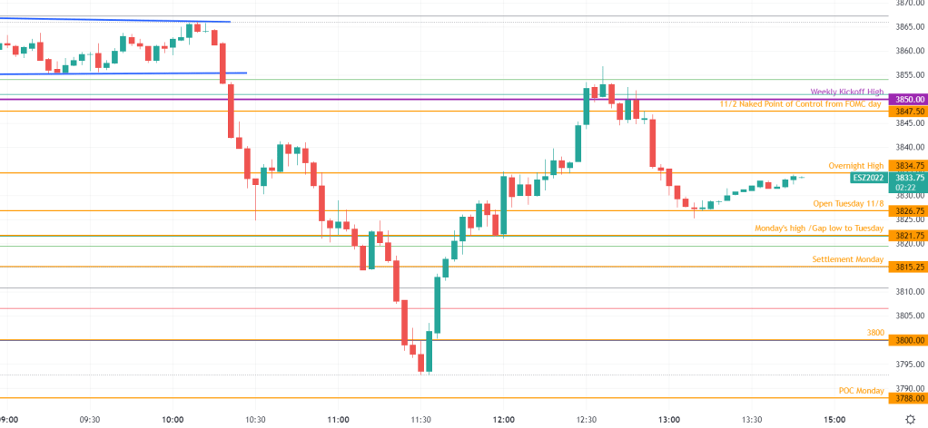 Price tested down to 3810.75 which was not the overnight low but below yesterday’s settlement. The overnight low was at 3800. On the upside, we are currently resting at the POC from 11/2 FOMC day and 3850 which is also a major inflection point.