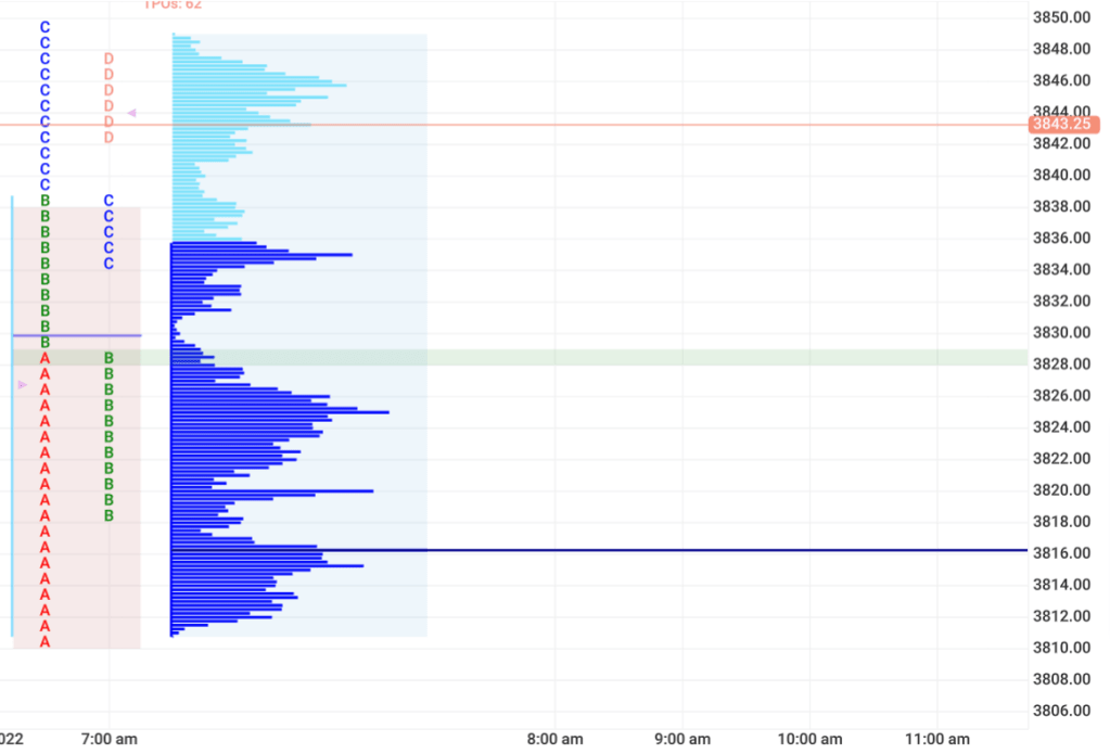 So far as of 8 am we have had two range extensions to the upside in B and C period. The IB was 38.25 points, we opened with some overnight longs and a gap to the upside that was closed very quickly early on. The POC is at 3828.50.