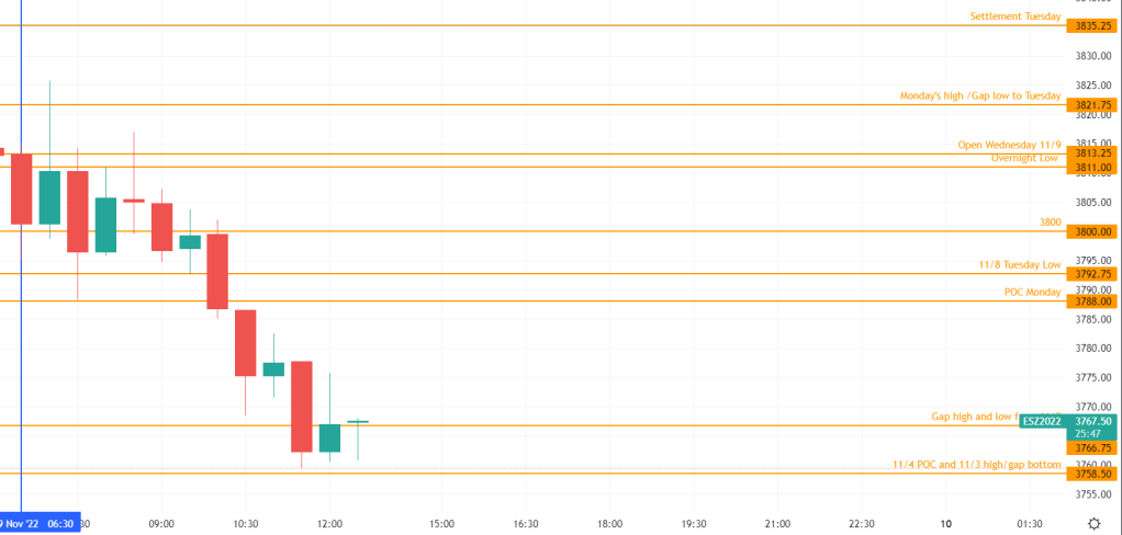 The IB is very small with 30 points arguing for an upset, so far we had one small range extension to the downside in C period. The POC is at 3807. Price is circling back through OPEN multiple times already.