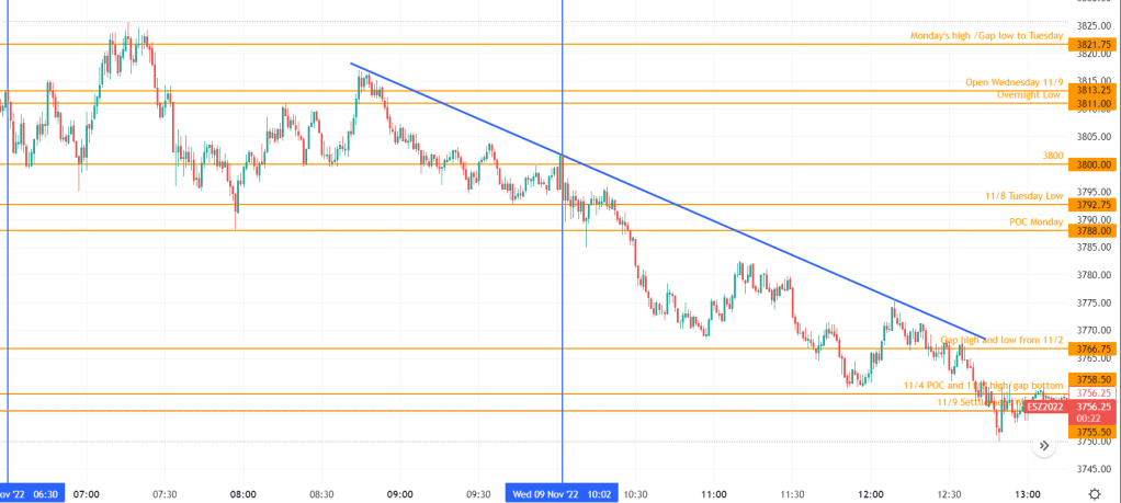 The 3800 level had no more buyers on the footprint chart at 10:02 am after which price kept dropping today. This would have been a tricky trade location for a short since it was right on the POC.